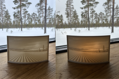Den raka litofanen levereras med ett enkelt stativ som håller bilden stadigt på plats. Det ger en stabil bas och rätt vinkel för naturlig genomlysning.
